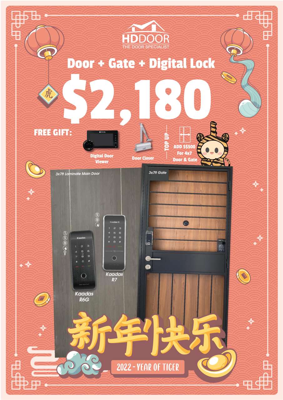 Home Entrance Package 2: 3x7Ft Laminate Main Door + 3x7Ft Gate + Kaadas R6G Digital Door Lock + Kaadas R7 Gate Lock – $2180