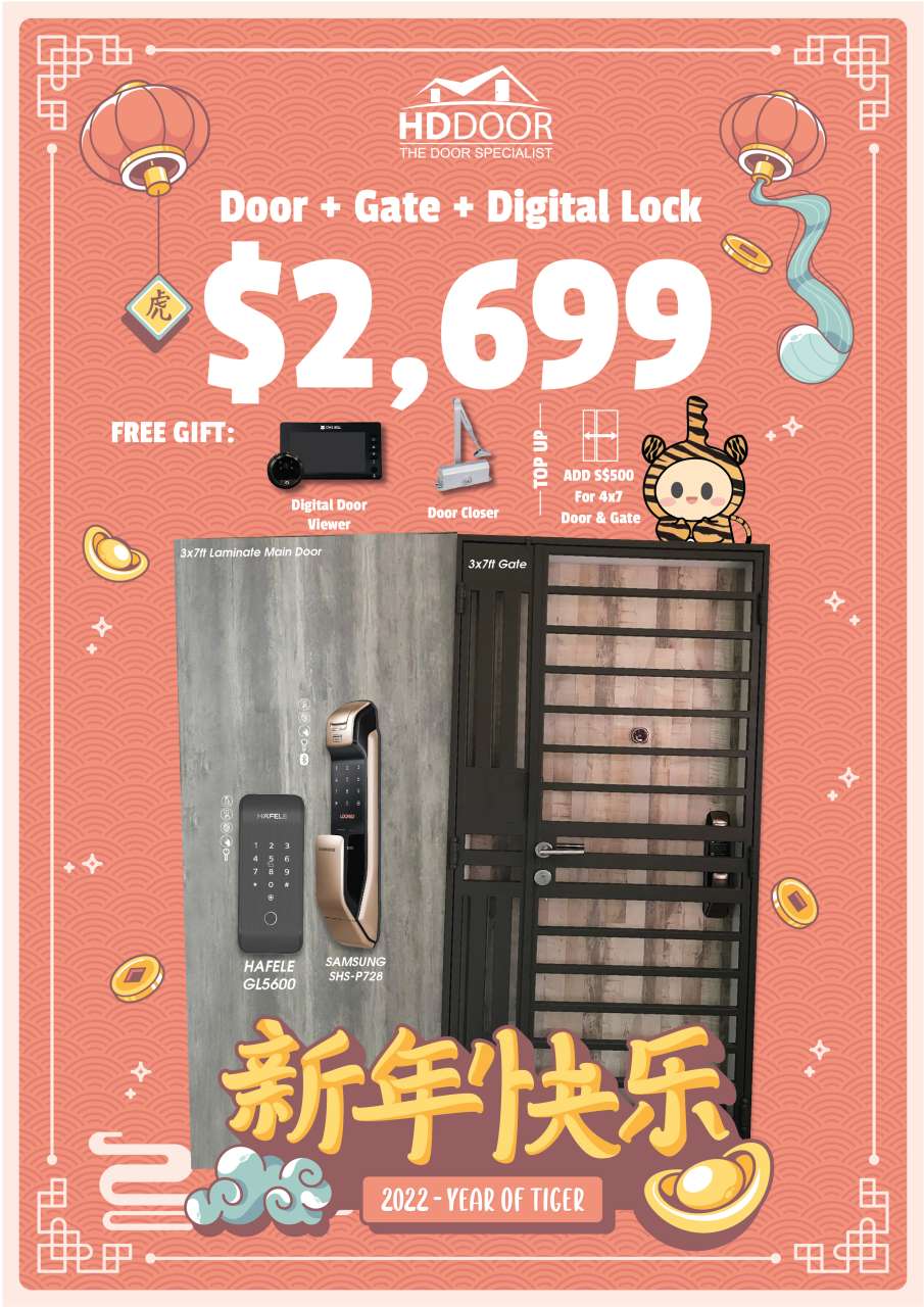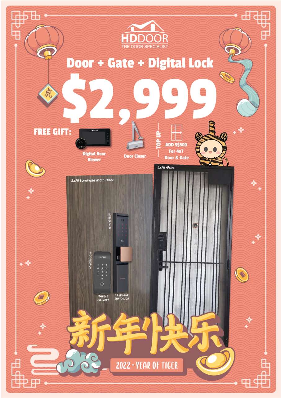 Home Entrance Package 11: 3x7Ft Laminate Main Door + 3x7Ft Gate + Samsung SHP-DP609 Digital Door Lock + Hafele GL5600 Gate Lock – $2799