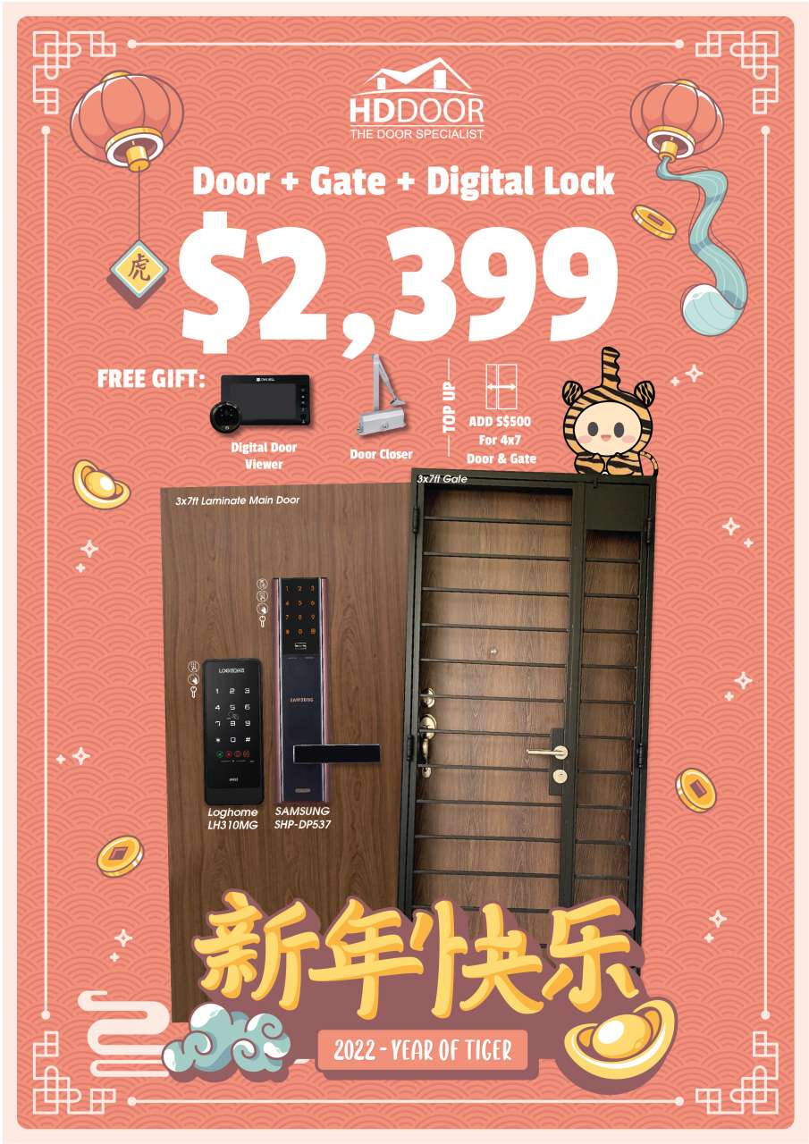 Home Entrance Package 4: 3x7Ft Laminate Main Door + 3x7Ft Gate + Samsung SHP-DP537 Digital Door Lock + Loghome LH310MG Digital Gate Lock – $2399