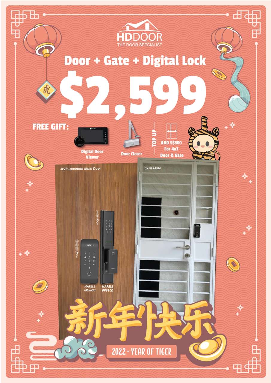 Home Entrance Package 9: 3x7Ft Laminate Main Door + 3x7Ft Gate + Hafele PP8100 Digital Door Lock + Hafele GL5600 Gate Lock – $2599
